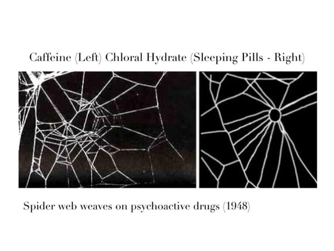 Being a pharmacologist, Peter Witt was naturally inclined to administer minute doses of psychoactive drugs such as amphetamine, mescaline, strychnine, LSD, and caffeine in hopes of altering the creature’s habitual cycle. Dosed through a diluted sugar water compound, each spider not only spun between 2-5am but created sporadic and inconsistent webs with varying differences between each drug. Although in theory the experiment failed, the obscurity behind each web delighted Witt who (at the time) was studying the abnormality of psychoactive drugs in the nervous system - on human subjects. He found the insects created unusual radii and smaller webs at 10 µg of caffeine/spider and further obscurities at 100 µg, other drugs creating just as obscure web patterning.